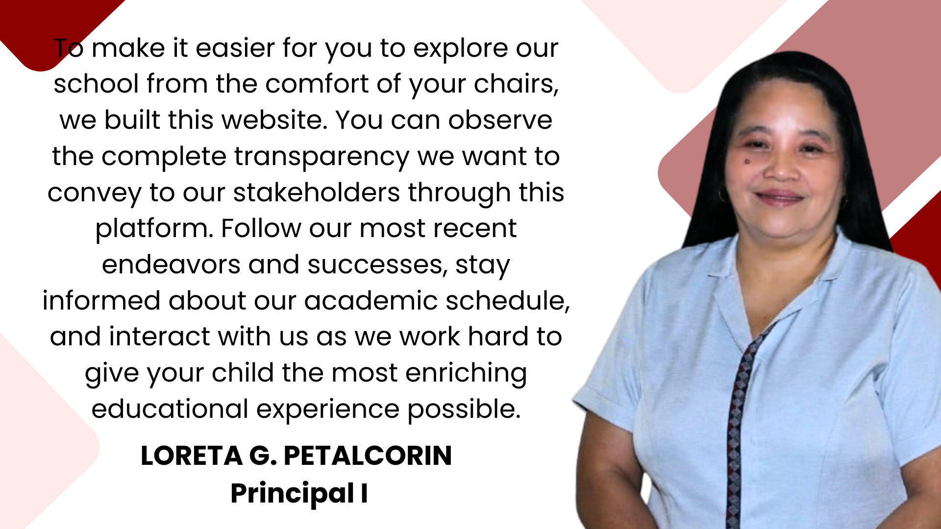 Hello! Welcome to our school's website! I am Melanie Majerano, CES website administrator. As you go through our site, you'll learn more about our school; our vision and mission as part of the DepEd family, our learners, and our community. Have fun browsing!